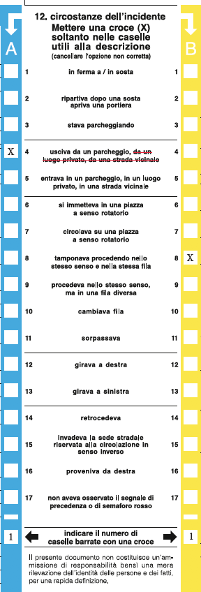 Si tratta di una serie di risposte chiuse che permettono di comprendere la dinamica dell’incidente. Elimina con una linea la voce errata, lasciando visibile quella corretta, ed indica all’interno dei quadrati a sinistra e a destra, con una X, il veicolo che si trova in quella determinata circostanza. Alla fine, indica il numero di caselle barrate. Ecco un esempio: